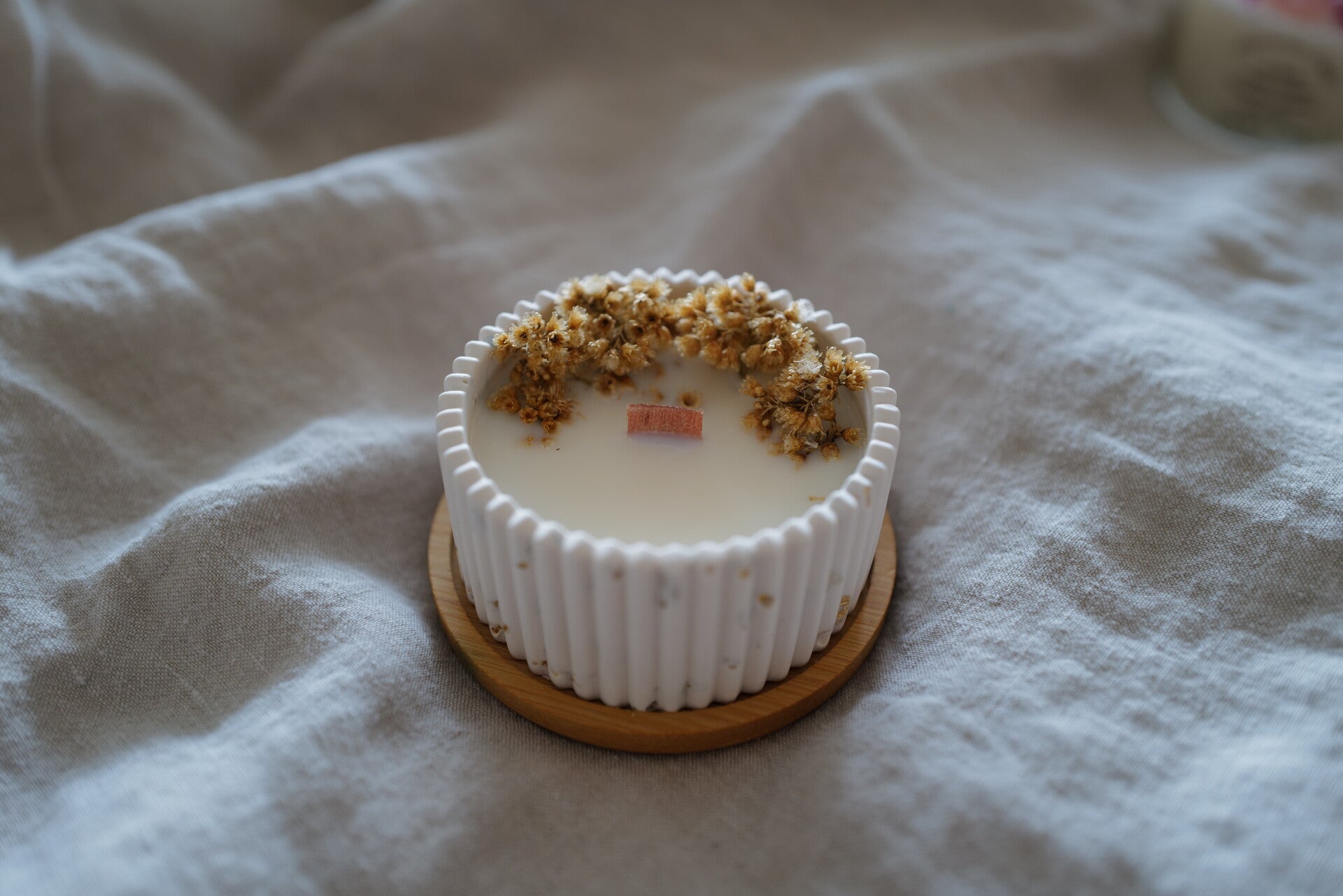 Bougies florales coulées à la cire de Soja dans un contenant fabriqué par mes soins à la Jesmonite, délicatement décorées de fleurs séchées d'Immortelle venant directement de mon jardin en Corse